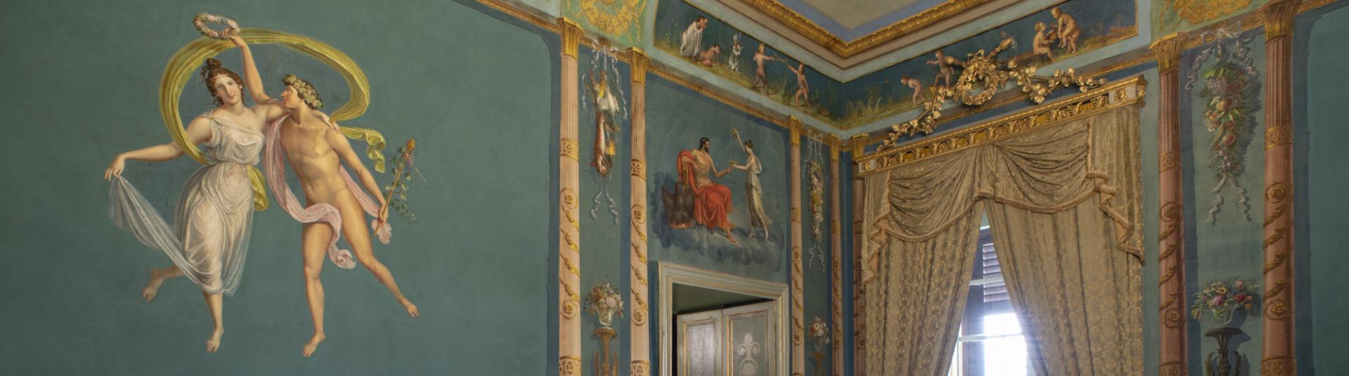 L’ambiente è parte della cosidetta Galleria Pompeiana voluta da Leopoldo di Borbone, luogotenente di Sicilia dal 1830 al 1835. La Sala, dallo sfondo verde tendente all’azzurro, venne decorata intorno al 1830 da Giuseppe Patania, secondo i gusti dello stile neoclassico, con rappresentazioni mitologiche, prendendo spunto dalle scoperte archeologiche di Ercolano e Pompei, tra le quali, al centro della volta, Eros e Afrodite su un carro.