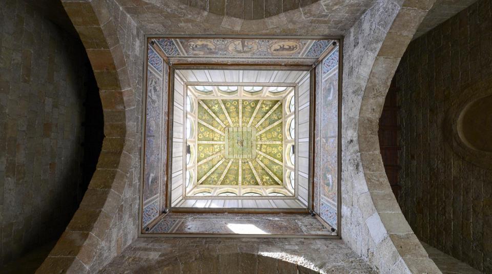 La Chiesa, dedicata a San Pietro Apostolo, presenta una pianta nella quale gli elementi latini e bizantini convivono, creando un unicum architettonico potenziato dagli apparati musivi. Nella cupola domina l’immagine del Cristo Pantocratore che si ripete nel catino dell’abside centrale. Tra mosaici più antichi nel presbiterio, è possibile ammirare scene del Nuovo testamento, tra le quali spicca il battesimo di Cristo, opera unica per raffinatezza stilistica.