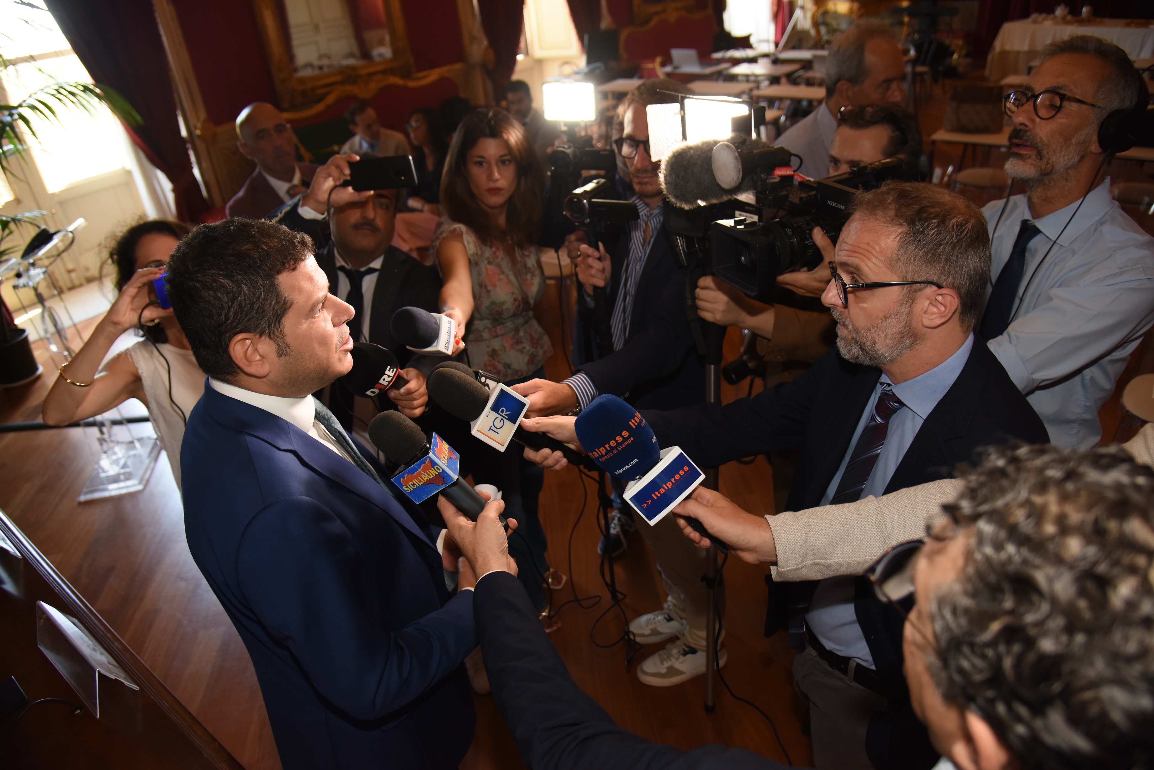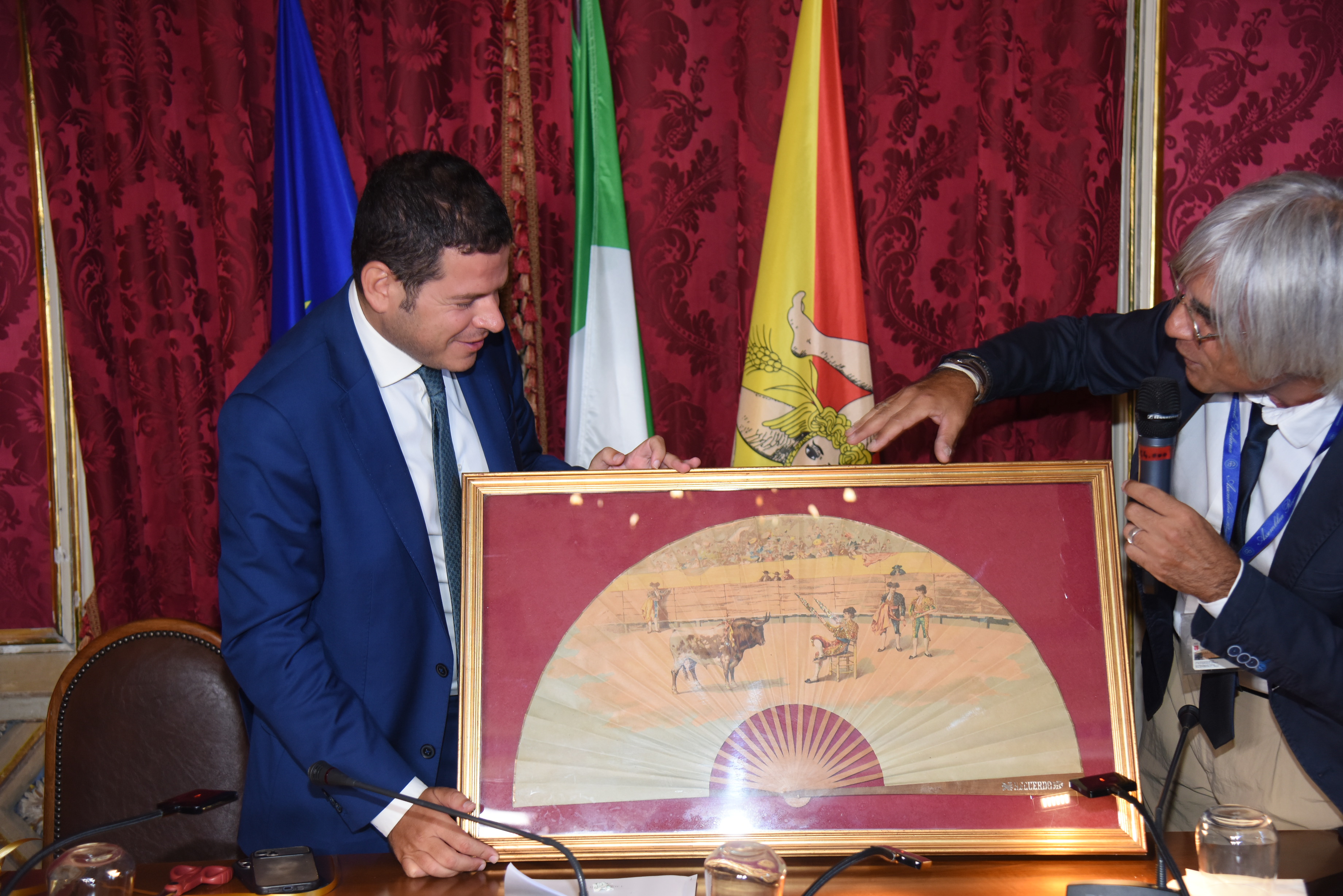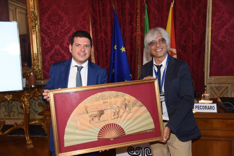 La tradizionale cerimonia del Ventaglio, organizzata dalla stampa parlamentare come ogni anno a ridosso della pausa estiva, è stata l’occasione per parlare del lavoro svolto, in questi mesi, dal Parlamento siciliano. Nella Sala La Torre di Palazzo dei Normanni, il Presidente della stampa parlamentare Alfredo Pecoraro, ha donato al Presidente dell’Ars Gaetano Galvagno, un ventaglio dei primi del '900 dipinto a mano su legno e raffigurante una scena della corrida spagnola.