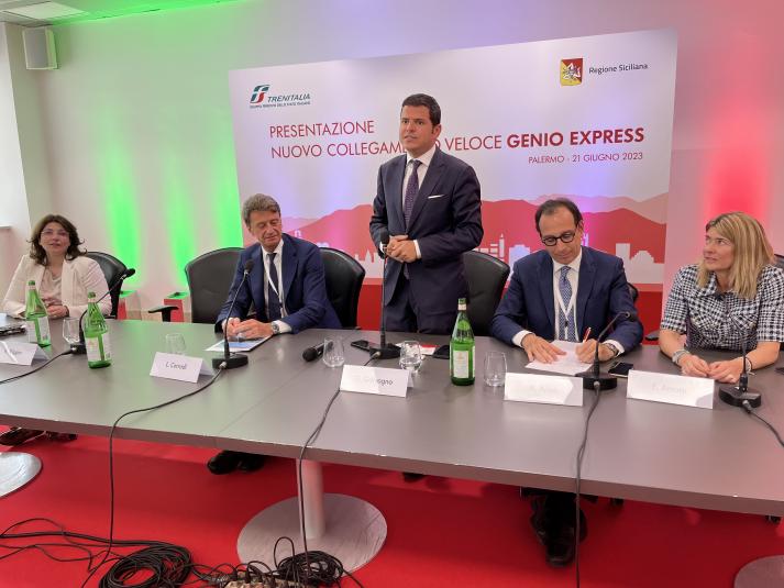 Inaugurato il Genio Express dalla stazione centrale di Palermo all’aeroporto di Punta Raisi in soli 34’. Anche in Sicilia un servizio a misura di turista. Alla presentazione del servizio di Trenitalia, insieme al Presidente della Regione Renato Schifani, agli assessori Elvira Amata e Alessandro Aricò, alla vicesindaco l’On. Carolina Varchi, all’a.d. di Trenitalia Luigi Corradi e all’a.d. di Gesap Vito Riggio.
