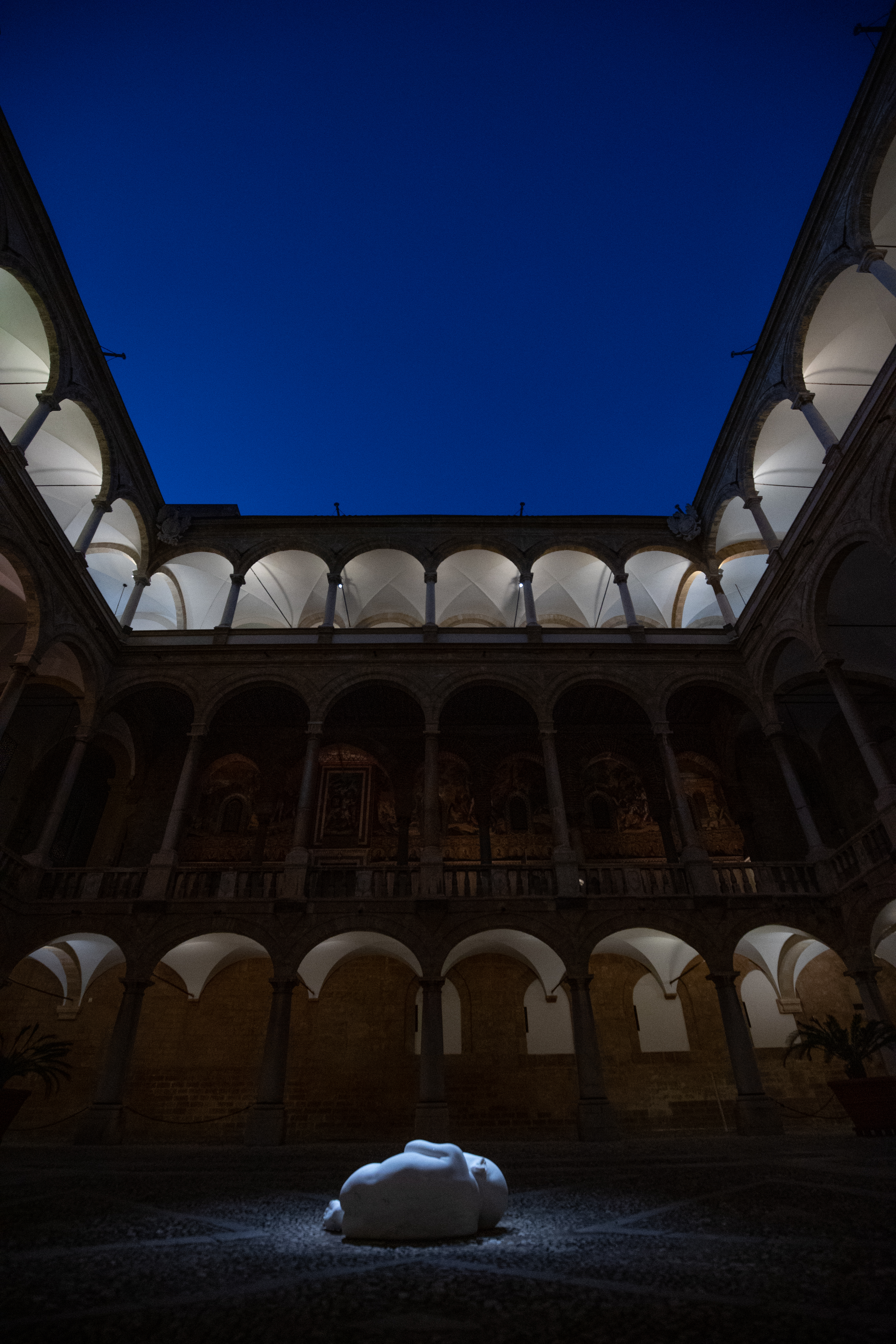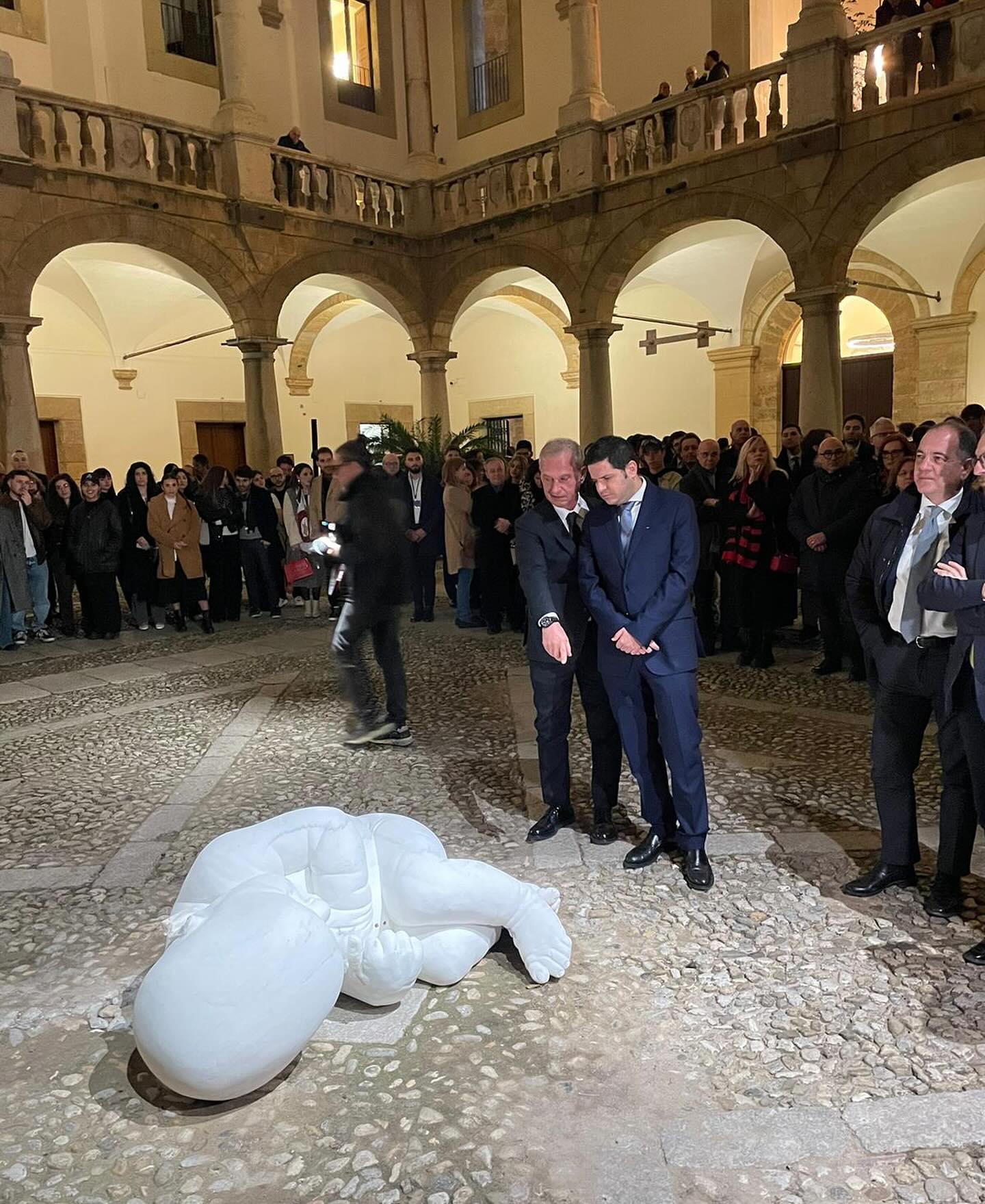 Presentata a Palazzo Reale l’opera dello scultore Jago, dal titolo “Look down”. La scultura ritrae un bambino sdraiato in posizione fetale ed è un invito a guardare in basso, verso gli ultimi, verso i più fragili. L’opera rimarrà esposta nel Cortile Maqueda fino ai primi di giugno.