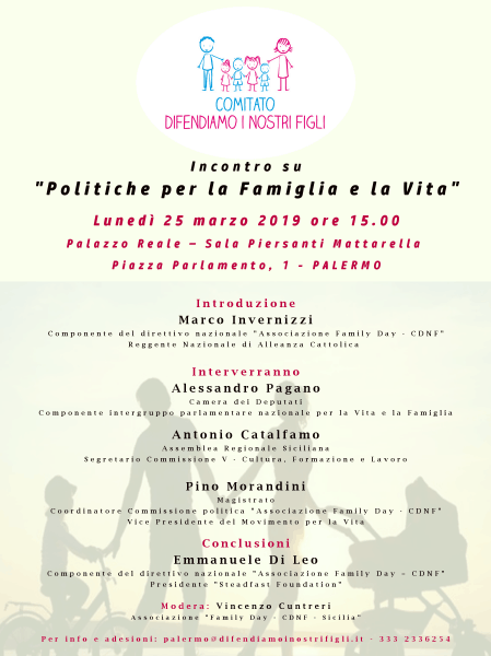 ore 16.30 – Intervento di Antonio Catalfamo, deputato dell’Assemblea Regionale Siciliana e segretario della commissione “V – Cultura, Formazione e Lavoro”, dal titolo “Famiglia e Vita in Assemblea Regionale Siciliana: cosa si è fatto, cosa si può fare“.