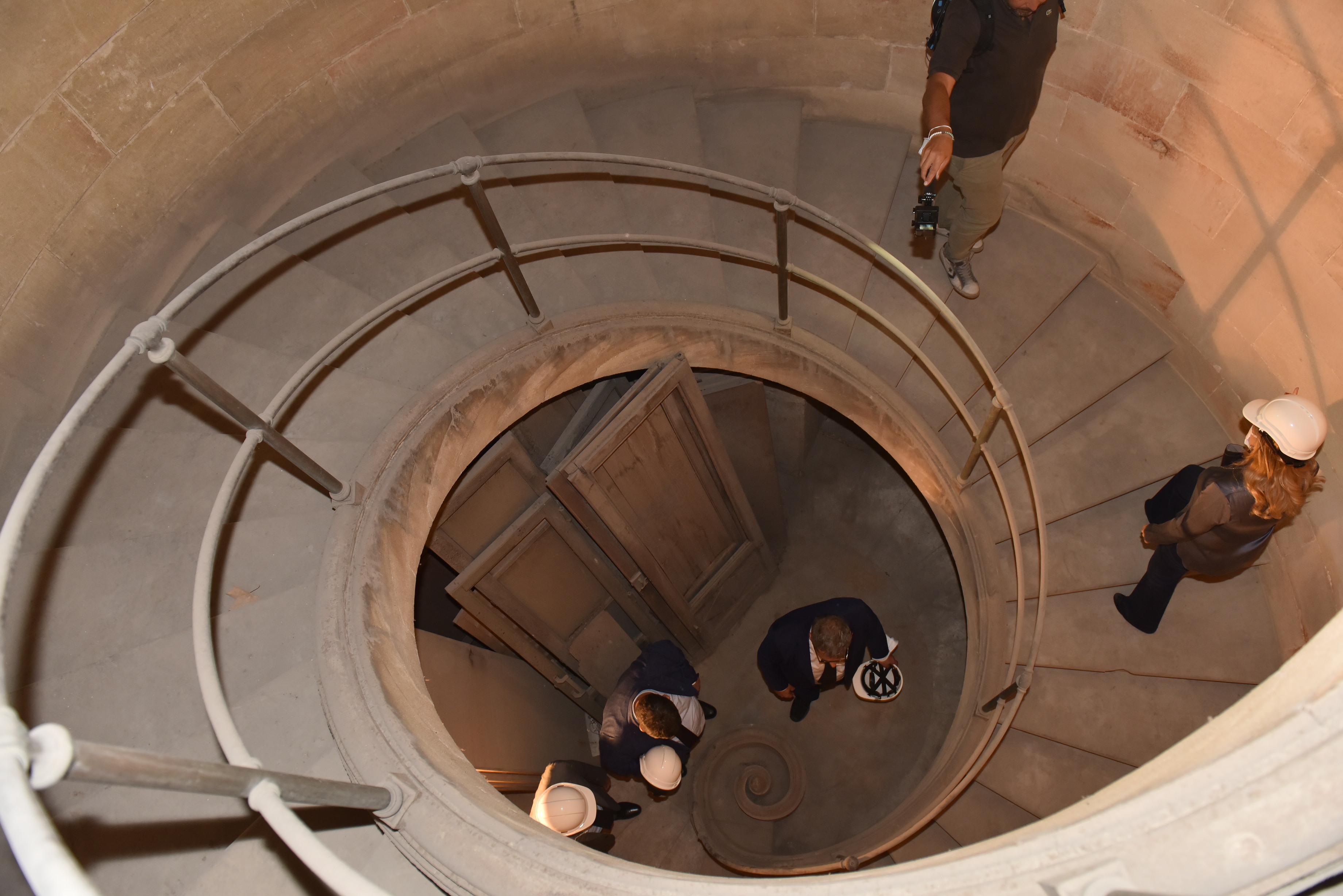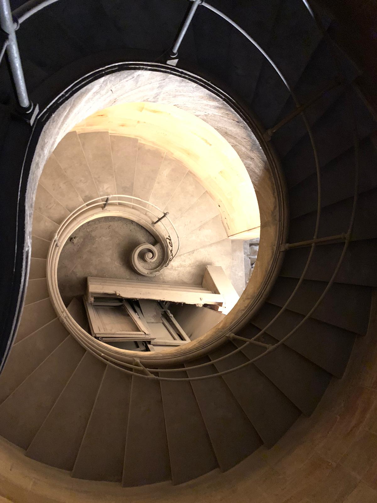 I lavori di trasformazione e ampliamento, proseguiti fino al 1853, variarono in gran parte l’originaria conformazione planimetrica e l’aspetto dell’edificio in quanto furono inglobati altri fabbricati di più ridotte dimensioni esistenti palazzo tra lo stesso e l’Ospedale di S. Giacomo che, originariamente era a due piani. Oltre a questi interventi all’architetto era richiesta una soluzione di collegamento verticale con l’ultima elevazione dell’adiacente Ospedale di San Giacomo. Una funzione secondaria, quindi, per assolvere alla quale non erano necessarie geometrie complesse o finiture particolari, poiché anche una scala a pianta rettangolare o quadrata, e magari semplicemente intonacata, sarebbe stata sufficiente. Giachery sceglie invece di realizzare un capolavoro di stereotomia, fornendo una prova tangibile delle sue conoscenze teoriche sul taglio della pietra.